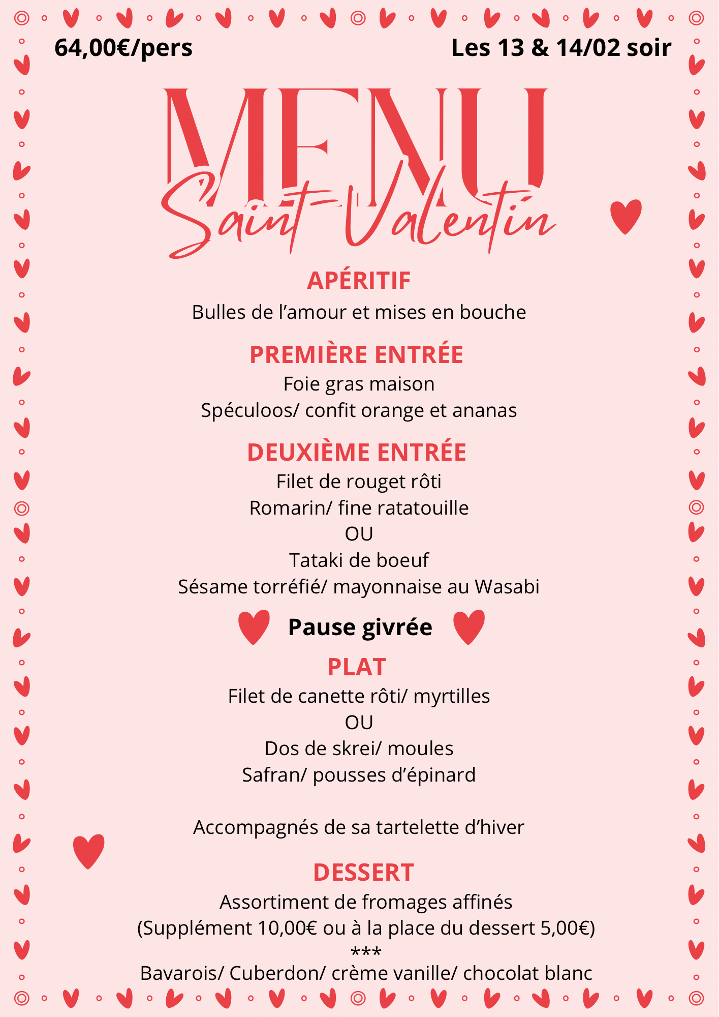 Parce que l’amour se savoure aussi dans l’assiette, découvrez notre menu Saint-Valentin et vivez une soirée pleine d’émotions.